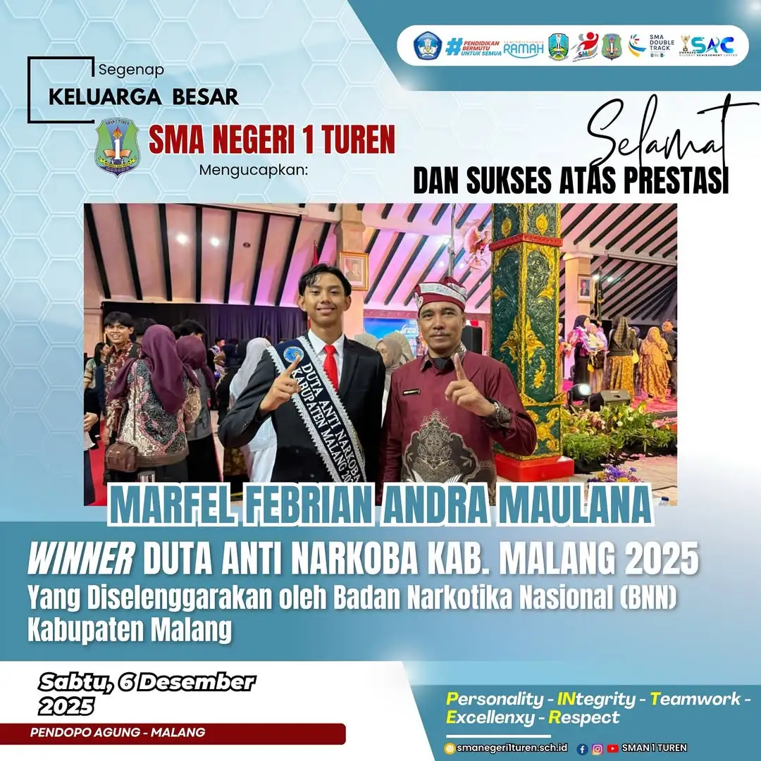 Marfel Febrian Andra Maulana, Winner Duta Anti Narkoba Kabupaten Malang 2025, ajang bergengsi yang diselenggarakan oleh Badan Narkotika Nasional (BNN) Kabupaten Malang.