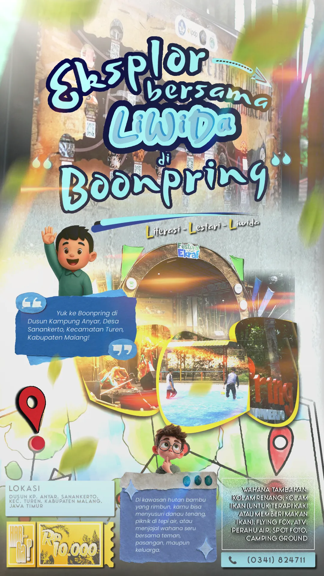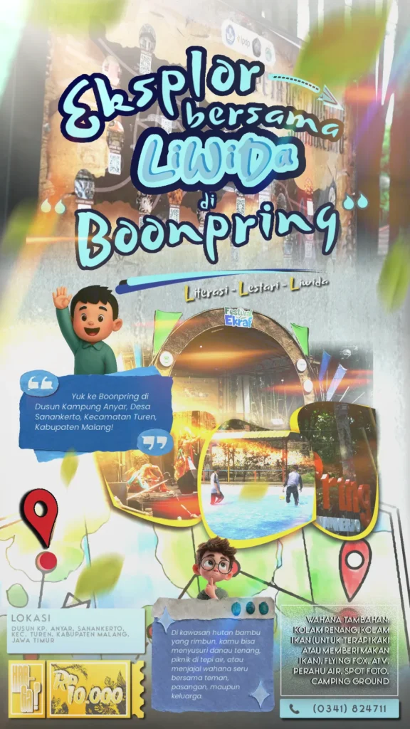 Bosen akhir pekan di rumah aja? Mau “refresh” otak dengan suasana asri penuh pepohonan? Yuk ke Boonpring di Dusun Kampung Anyar, Desa Sanankerto, Kecamatan Turen, Kabupaten Malang! Di kawasan hutan bambu yang rimbun, kamu bisa menyusuri danau tenang, piknik di tepi air, atau menjajal wahana seru bersama teman, pasangan, maupun keluarga. Namanya pun unik: “Boonpring”, anugerah bambu nantinya kamu akan paham kenapa banyak bambu di sini dan mengapa suasananya begitu menenangkan.